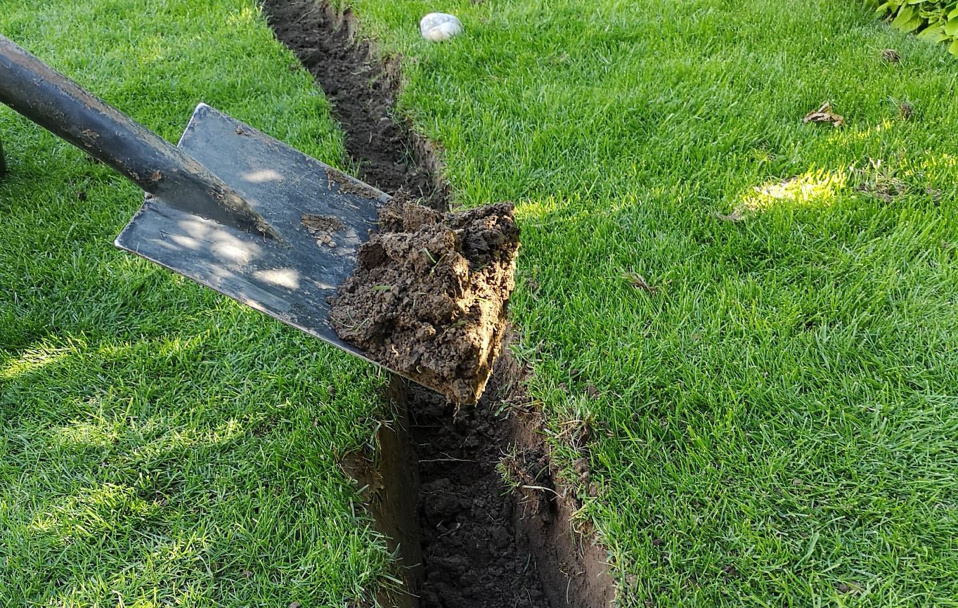 How beautiful the trenches are made does not really matter, as long as you reach the necessary depth. I deliberately do not go into the width, because only a very small width in the amount of the pipe diameter is necessary, which is exceeded with manual shoveling anyway. The challenge is rather not to get too wide so that the excavation does not become unnecessarily large. I myself like to work in such a way that I first pierce deeply with the spade along the canal to be shoveled and then repeat the whole thing about 4-6 inches apart. I then dig the pricked strip of lawn in a second step.