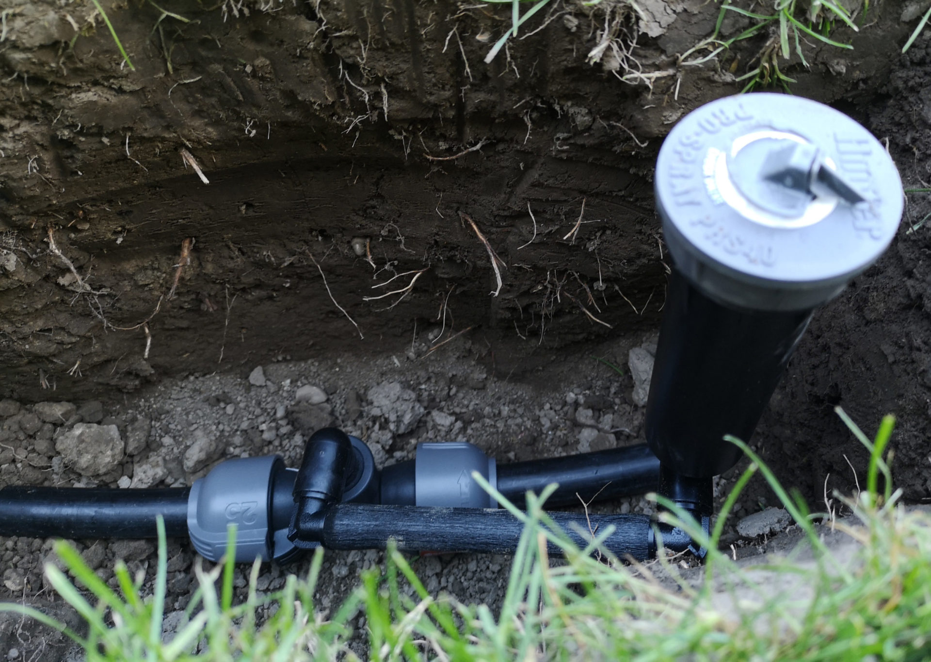 In the final test run, it is checked that the connected sprinklers are working correctly. This is just a matter of checking that the sprinklers are basically working and that they are meeting the expected throw distance. The fine adjustment of throw distance and irrigation sector only takes place at the end, after the trench has been filled in.
