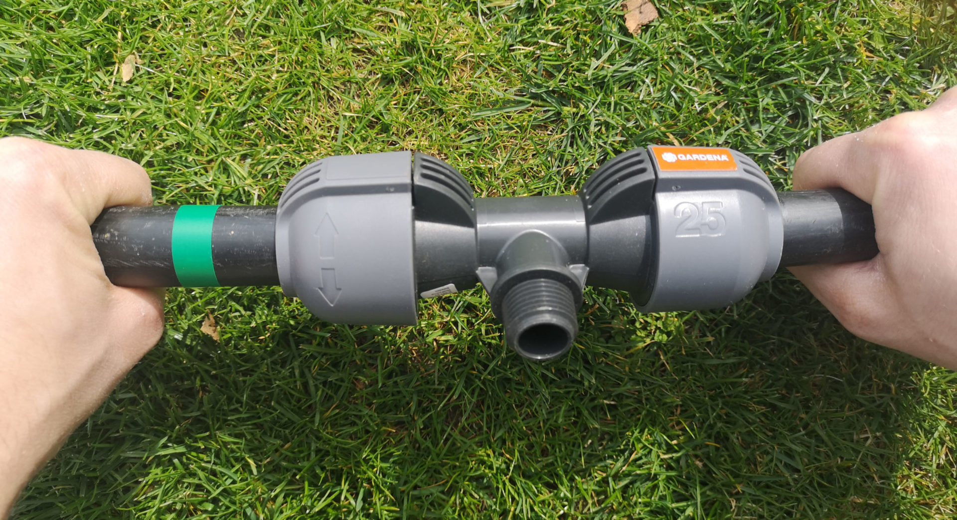 With this variant, too, you first have to interrupt the pipeline with a sprinkler connection connector. Only here you don’t use a connector with an external thread, but one with an internal thread. And such connectors are only available with a 3/4 inch internal thread connection. Alternatively, you can also use a so-called “tapping clamp”. With this, the pipeline pipe is not interrupted, but the clamp is screwed onto the pipe and then a hole is drilled into the pipe at the point specified by the clamp. Further handling is the same as with the connector.