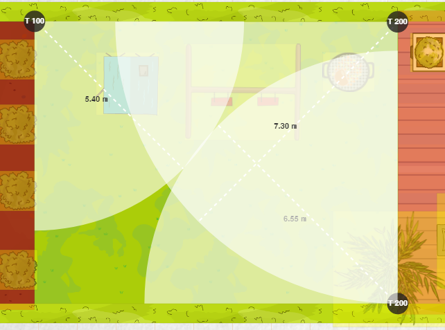 At the top left there is a control bar with which you can limit the display to specific zones. In my case, the automatic system planned 4 zones to be watered. By default, the irrigated areas are displayed with arcs. Based on the intensity of the color you can see which areas are poured more and which less overlapping. Alternatively, you can switch to a sprinkler view and a pipeline view.