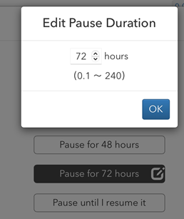 Irrigation can be suspended for any duration between 0.1 and 240 hours, or paused indefinitely (with common presets such as 6, 12, 24, 48, and 72 hours).